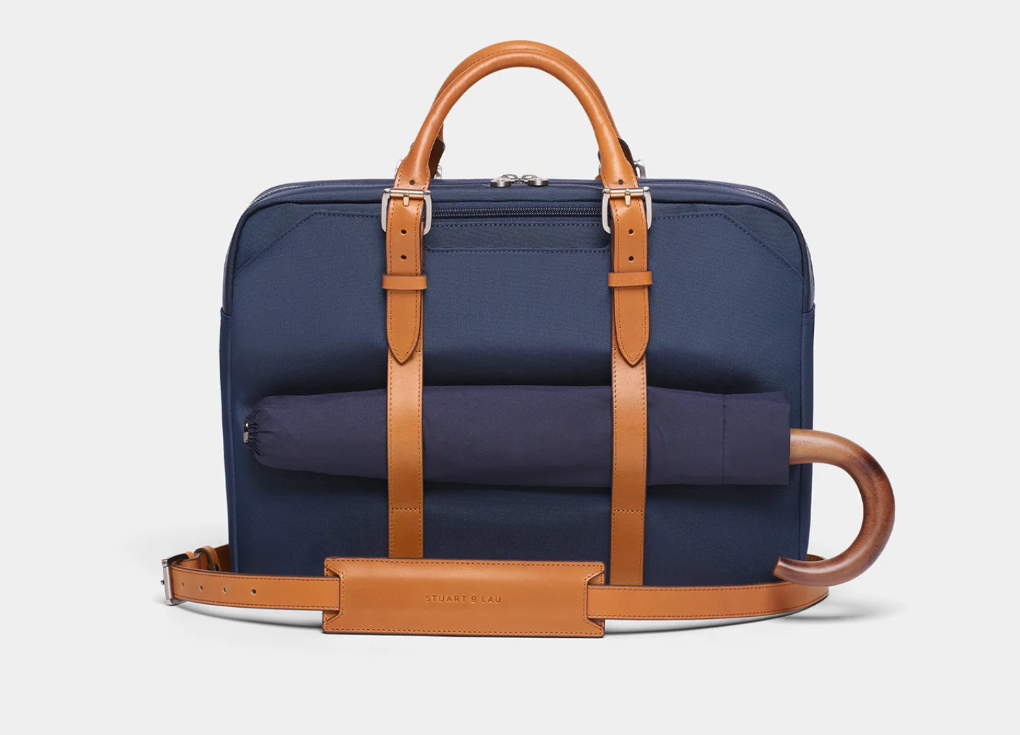 The umbrella slot is on the backside of the briefcase, where you'll see that the leather bands/straps are not sewn down to the fabric of the bag—which allows you to slide the umbrella behind the bands and against the body of the bag, like shown below: