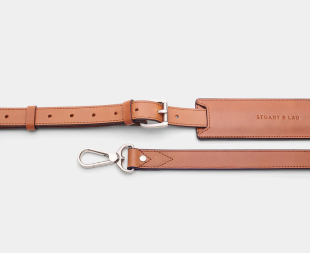 The shoulder strap that is shown below is adjustable and measures 42" at the shortest length and 50" at the longest length, clip to clip. These strap comes standard with our Cary Briefcase and the Monaco Weekender Bag.